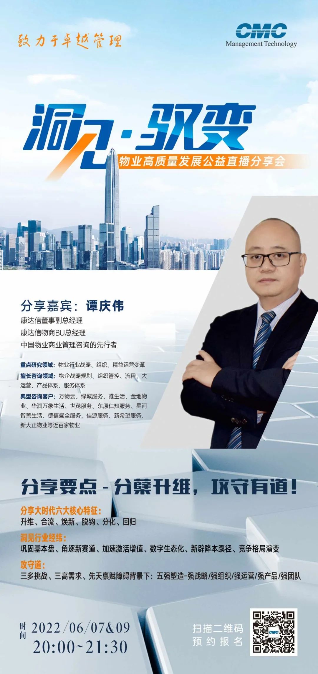 公益直播分享会由康达信董事副总经理、物商BU总经理谭庆伟先生作为主讲嘉宾,结合当下物企所在面临的政策/环境/行业格局时代背景,基于“升维-脱钩-合流-分化-焕新-回归”六大维度,分享康达信对于物企未来“巩固基本盘-角逐新赛道-加速激活增值-数字生态化-新辟降本蹊径-竞争格局演变”的“攻守道”。并着重在如何打造强战略/强组织/强运营/强产品/强团队五个层面,对品牌物企、中小物企的变革阐述了康达信的新洞见和新思维。公益直播分享会分为上下两个环节,分别于6月7日和6月9日晚8:00-9:30举办。
